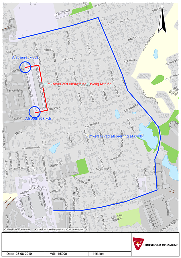 Krydset Usserød Kongevej/Birkevej afspærres i alle retninger fra onsdag d. 11. september til (senest) lørdag d. 14. september. Der vil være skiltet omkørsel via Bolbrovej, Alsvej og Ørbæksvej